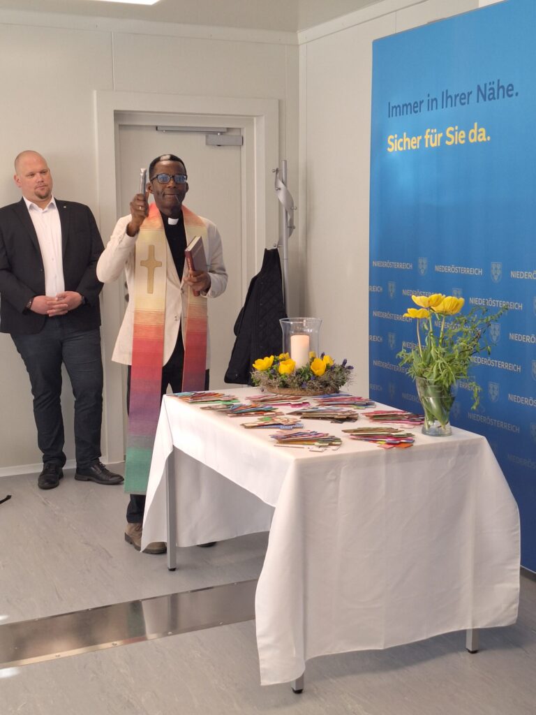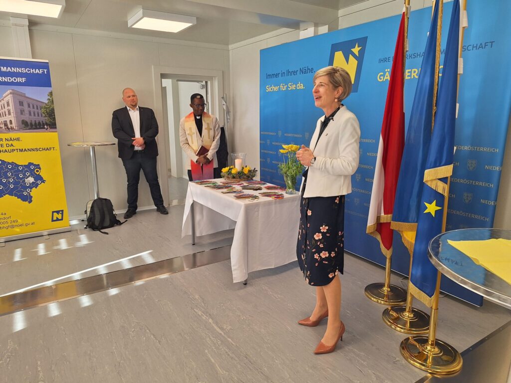 Dort fand die Übergabe von im Kunstunterricht gestalteten Holzkreuzen für die Räumlichkeiten der Bezirkshauptmannschaft Gänserndorf im Beisein der Bezirkshauptfrau Claudia Pfeiler-Blach und Herrn Pfarrer Dr. Chudi Joseph Ibeanu, der auch die Segnung der Kreuze vornahm, statt.
